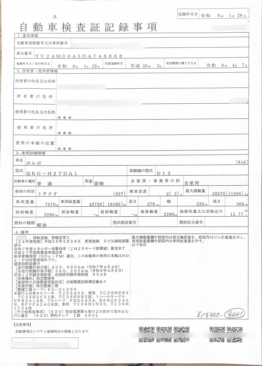 車検付ボルボ11.5tトラクターヘッド